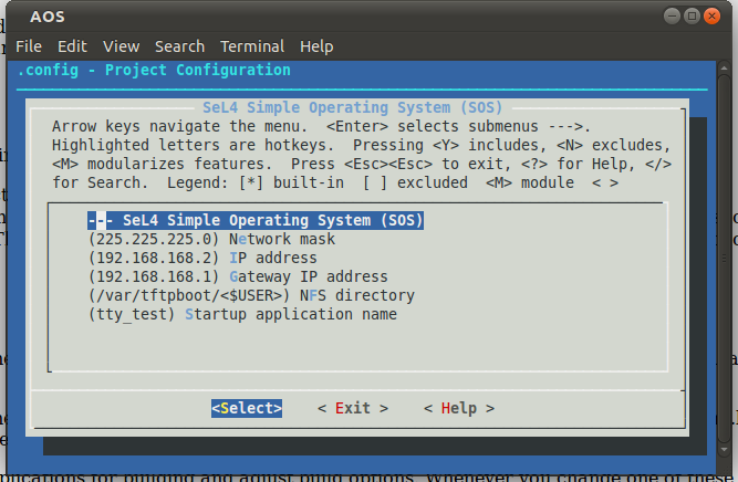 - Startup application name: Once SOS is initialised, SOS will proceed to load an initial process from its cpio image. This configuration options provides the name of the application to load. In later milestones, this option will need to be changed to sosh or to the name of a testing application that you may have created.