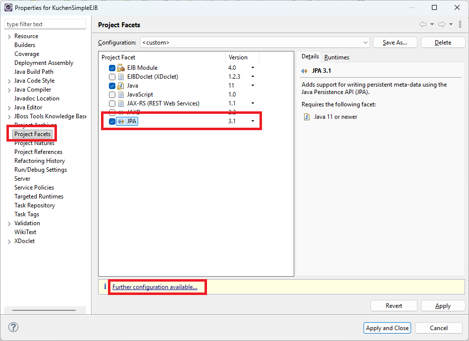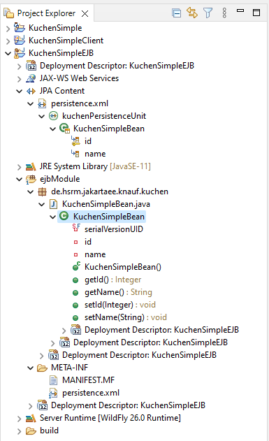 </persistence> 11:40:52,438 INFO [stdout] (ServerService Thread Pool -- 84) Hibernate: drop table if exists KuchenSimpleBean 11:40:52,452 INFO [stdout] (ServerService Thread Pool -- 84) Hibernate: drop sequence KuchenSimpleBean_SEQ 11:40:52,462 WARN [org.mariadb.jdbc.message.server.ErrorPacket] (ServerService Thread Pool -- 84) Error: 4091-42S02: Unknown SEQUENCE: 'jbosstest.kuchensimplebean_seq' 11:40:52,463 WARN [org.hibernate.tool.schema.internal.ExceptionHandlerLoggedImpl] (ServerService Thread Pool -- 84) GenerationTarget encountered exception accepting command : Error executing DDL "drop sequence KuchenSimpleBean_SEQ" via JDBC [(conn=15) Unknown SEQUENCE: 'jbosstest.kuchensimplebean_seq']: org.hibernate.tool.schema.spi.CommandAcceptanceException: Error executing DDL "drop sequence KuchenSimpleBean_SEQ" via JDBC [(conn=15) Unknown SEQUENCE: 'jbosstest.kuchensimplebean_seq'] at org.hibernate@6.6.19.Final//org.hibernate.tool.schema.internal.exec.GenerationTargetToDatabase.accept(GenerationTargetToDatabase.java:94) at org.hibernate@6.6.19.Final//org.hibernate.tool.schema.internal.Helper.applySqlString(Helper.java:233) at org.hibernate@6.6.19.Final//org.hibernate.tool.schema.internal.Helper.applySqlStrings(Helper.java:217) at org.hibernate@6.6.19.Final//org.hibernate.tool.schema.internal.SchemaDropperImpl.dropSequences(SchemaDropperImpl.java:343) at org.hibernate@6.6.19.Final//org.hibernate.tool.schema.internal.SchemaDropperImpl.dropConstraintsTablesSequences(SchemaDropperImpl.java:269) at org.hibernate@6.6.19.Final//org.hibernate.tool.schema.internal.SchemaDropperImpl.dropFromMetadata(SchemaDropperImpl.java:218) at org.hibernate@6.6.19.Final//org.hibernate.tool.schema.internal.SchemaDropperImpl.performDrop(SchemaDropperImpl.java:186) at org.hibernate@6.6.19.Final//org.hibernate.tool.schema.internal.SchemaDropperImpl.doDrop(SchemaDropperImpl.java:156) at org.hibernate@6.6.19.Final//org.hibernate.tool.schema.internal.SchemaDropperImpl.doDrop(SchemaDropperImpl.java:116) at org.hibernate@6.6.19.Final//org.hibernate.tool.schema.spi.SchemaManagementToolCoordinator.performDatabaseAction(SchemaManagementToolCoordinator.java:238) at org.hibernate@6.6.19.Final//org.hibernate.tool.schema.spi.SchemaManagementToolCoordinator.lambda$process$5(SchemaManagementToolCoordinator.java:144) at java.base/java.util.HashMap.forEach(HashMap.java:1421) at org.hibernate@6.6.19.Final//org.hibernate.tool.schema.spi.SchemaManagementToolCoordinator.process(SchemaManagementToolCoordinator.java:141) at org.hibernate@6.6.19.Final//org.hibernate.boot.internal.SessionFactoryObserverForSchemaExport.sessionFactoryCreated(SessionFactoryObserverForSchemaExport.java:37) at org.hibernate@6.6.19.Final//org.hibernate.internal.SessionFactoryObserverChain.sessionFactoryCreated(SessionFactoryObserverChain.java:35) at org.hibernate@6.6.19.Final//org.hibernate.internal.SessionFactoryImpl.Dies kann aber ignoriert werden. In meinem Beispiel ist in "persistence.xml" eingestellt, dass die Tabellen bei jedem Deploy neu erzeugt werden sollen. Und in unserem Fall erfolgt durch den JBossTools-Plugin zuerst ein Undeploy der Anwendung - da werden die Tabellen gelöscht. Dann wird die Anwendung wieder auf den Server gelegt. Und dabei wird zuerst ebenfalls versucht, die vorhandene Datenstruktur zu löschen. Dies führt hier zu einem Fehler, weil das Löschen der Sequence ohne den Zusatz "drop sequence if exists" erfolgt: https://hibernate.atlassian.net/browse/HHH-19701. In Hibernate 7 sollte die Korrektur für diesen Fehler enthalten sein.(SessionFactoryImpl.java:324) at org.hibernate@6.6.19.Final//org.hibernate.boot.internal.SessionFactoryBuilderImpl.build(SessionFactoryBuilderImpl.java:463) at org.hibernate@6.6.19.Final//org.hibernate.jpa.boot.internal.EntityManagerFactoryBuilderImpl.build(EntityManagerFactoryBuilderImpl.java:1517) at org.hibernate.jipijapa-hibernate@37.0.0.Final//org.jboss.as.jpa.hibernate.TwoPhaseBootstrapImpl.build(TwoPhaseBootstrapImpl.java:32) at org.jboss.as.jpa@37.0.0.Final//org.jboss.as.jpa.service.PersistenceUnitServiceImpl$1$1.run(PersistenceUnitServiceImpl.java:159) at org.jboss.as.jpa@37.0.0.Final//org.jboss.as.jpa.service.PersistenceUnitServiceImpl$1$1.run(PersistenceUnitServiceImpl.java:117) at java.base/java.security.AccessController.doPrivileged(AccessController.java:399) at org.wildfly.security.elytron-base@2.6.4.Final//org.wildfly.security.manager.WildFlySecurityManager.doChecked(WildFlySecurityManager.java:664) at org.jboss.as.jpa@37.0.0.Final//org.jboss.as.jpa.service.PersistenceUnitServiceImpl$1.run(PersistenceUnitServiceImpl.java:201) at org.jboss.threads@3.9.1//org.jboss.threads.ContextHandler$1.runWith(ContextHandler.java:18) at org.jboss.threads@3.9.1//org.jboss.threads.EnhancedQueueExecutor$Task.doRunWith(EnhancedQueueExecutor.java:2651) at org.jboss.threads@3.9.1//org.jboss.threads.EnhancedQueueExecutor$Task.run(EnhancedQueueExecutor.java:2630) at org.jboss.threads@3.9.1//org.jboss.threads.EnhancedQueueExecutor.runThreadBody(EnhancedQueueExecutor.java:1622) at org.jboss.threads@3.9.1//org.jboss.threads.EnhancedQueueExecutor$ThreadBody.run(EnhancedQueueExecutor.java:1589) at java.base/java.lang.Thread.run(Thread.java:842) at org.jboss.threads@3.9.1//org.jboss.threads.JBossThread.run(JBossThread.java:501) Caused by: java.sql.SQLSyntaxErrorException: (conn=15) Unknown SEQUENCE: 'jbosstest.kuchensimplebean_seq' at deployment.mariadb-java-client-3.5.4.jar//org.mariadb.jdbc.export.ExceptionFactory.createException(ExceptionFactory.java:289) at deployment.mariadb-java-client-3.5.4.jar//org.mariadb.jdbc.export.ExceptionFactory.create(ExceptionFactory.java:378) at deployment.mariadb-java-client-3.5.4.jar//org.mariadb.jdbc.message.ClientMessage.readPacket(ClientMessage.java:187) at deployment.mariadb-java-client-3.5.4.jar//org.mariadb.jdbc.client.impl.StandardClient.readPacket(StandardClient.java:1379) at deployment.mariadb-java-client-3.5.4.jar//org.mariadb.jdbc.client.impl.StandardClient.readResults(StandardC