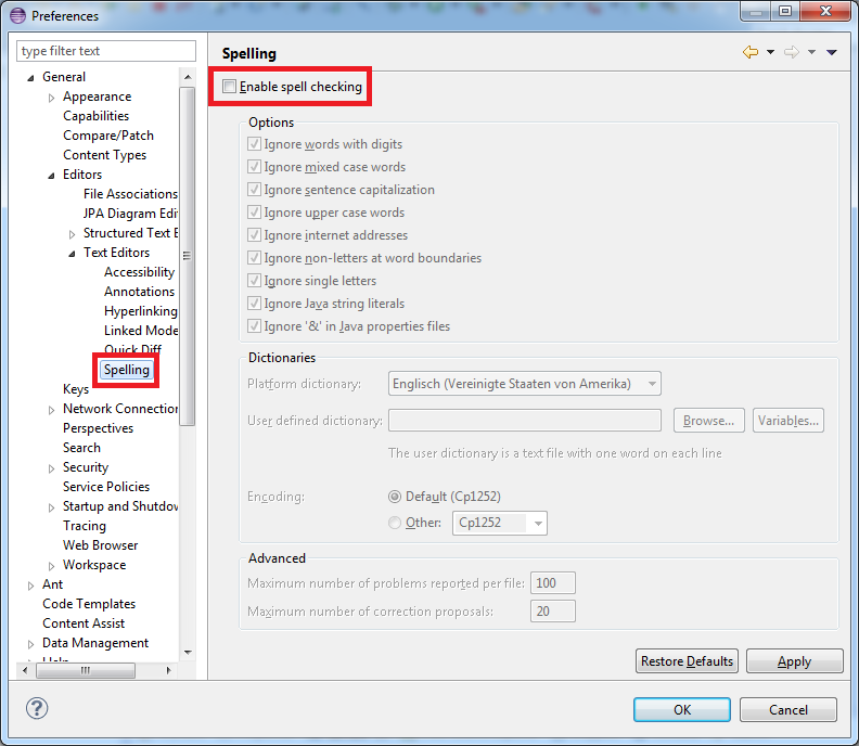 Die integrierte Rechtschreibprüfung (per Default sowieso nur englisches Wörterbuch) wird abgeschaltet da dies sehr viele Resources kostet: