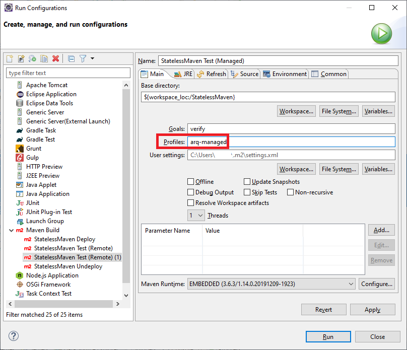 - Profile funktionieren nicht (zumindest habe ich keinen Weg gefunden, ein Profil anzugeben). Das bedeutet, dass wir das Profil "arq-wildfly-remote-web" als "Default" definieren müssen: