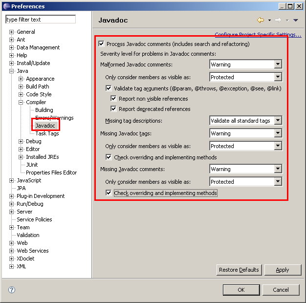 In den Preferences werden die JavaDoc-Warnungen eingeschaltet:
