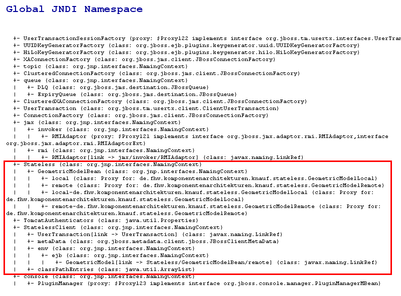 Im "Global JNDI Namespace" finden wir unsere diversen Beans (Remote- und Local-Interfaces) sowie den Environment Naming Context