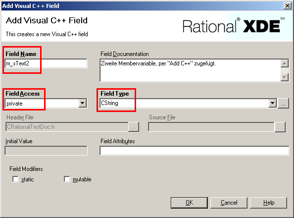 Wir geben dem Feld den Namen "m_sText2" und wählen Field Access und Field Type aus. Außerdem lassen wir uns nicht von