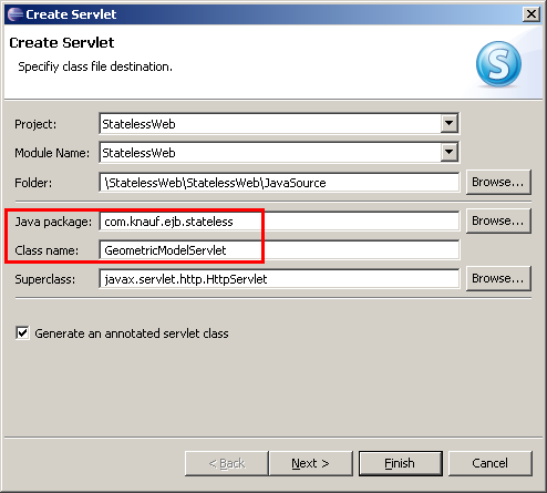 Im ersten Schritt des Assistenten der JSP den Namen "GeometricModelTest.jsp" geben (die Fehler-Icons